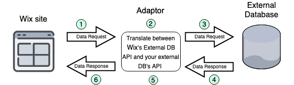 A Wix Data request is made to an external database collection. The request is sent to the adaptor.